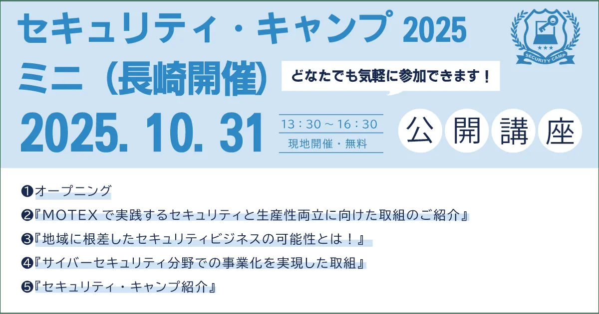 長崎県で行われる「セキュリティ・キャンプ2025ミニ」の公開講座が、2025年10月31日(金)に開催されることが発表されました。このイベントは、一般社団法人セキュリティ・キャンプ協議会が主催し、若手職員や地域ビジネスに携わる方々、さらにはセキュリティ分野に興味を持すべての方々が参加できる無料講座となっています。