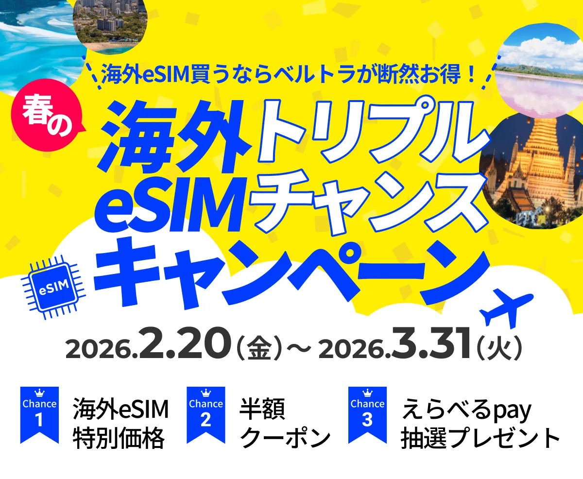 春休みやゴールデンウィークの海外旅行計画を立てている方に朗報です。現地体験型オプショナルツアーを専門に扱うベルトラ株式会社が、「春の海外旅行eSIMトリプルチャンスキャンペーン」を実施中。このキャンペーンでは、海外用のeSIMを特別価格で提供するほか、豪華特典も盛りだくさんです。 ブランドの名に恥じない利便性とお得感を味わいながら、心ゆさぶる旅の体験を手に入れましょう。