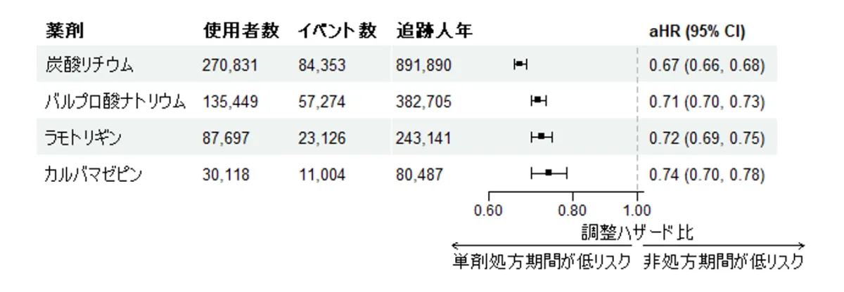 結果として、炭酸リチウム単剤療法は精神科入院リスクの低下と関連し、併用療法では、炭酸リチウムとカルバマゼピン、バルプロ酸ナトリウムなどとの組み合わせがさらに入院リスクを軽減することが分かりました。このデータは、単剤療法だけでは効果が不十分な患者に対し、新しい治療選択肢を提示します。