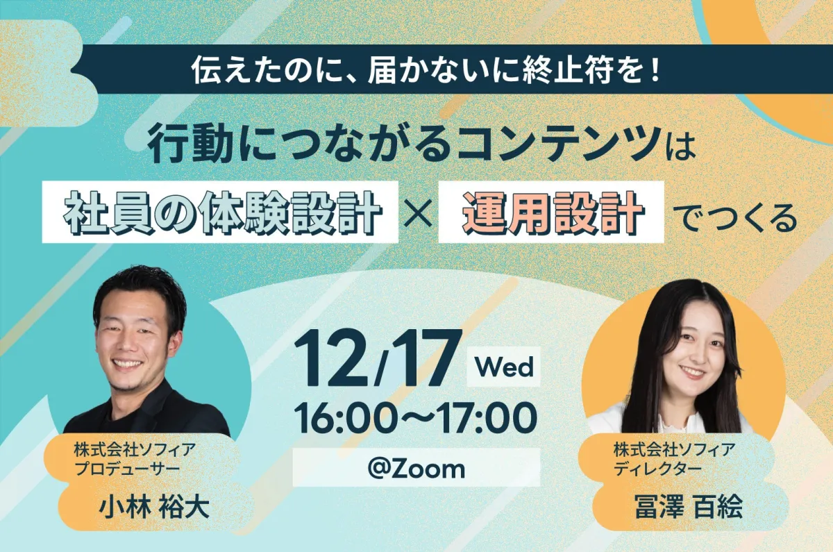 株式会社ソフィアが12月17日(水)に開催する無料セミナー『伝えたのに、届かないに終止符を! 行動につながるコンテンツは「社員の体験設計」×「運用設計」でつくる』が、企業内のコミュニケーション活性化に向けた新たな一歩となることを目指しています。