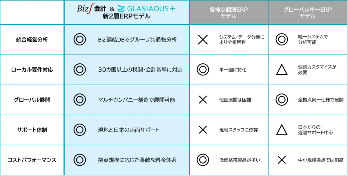 この新しいERPモデルは、従来のERPシステムにおける課題を解決することを目指しています。特に、海外拠点においては、コスト効率の良い運用を確立しつつ、グループ全体の統合経営分析が可能です。
