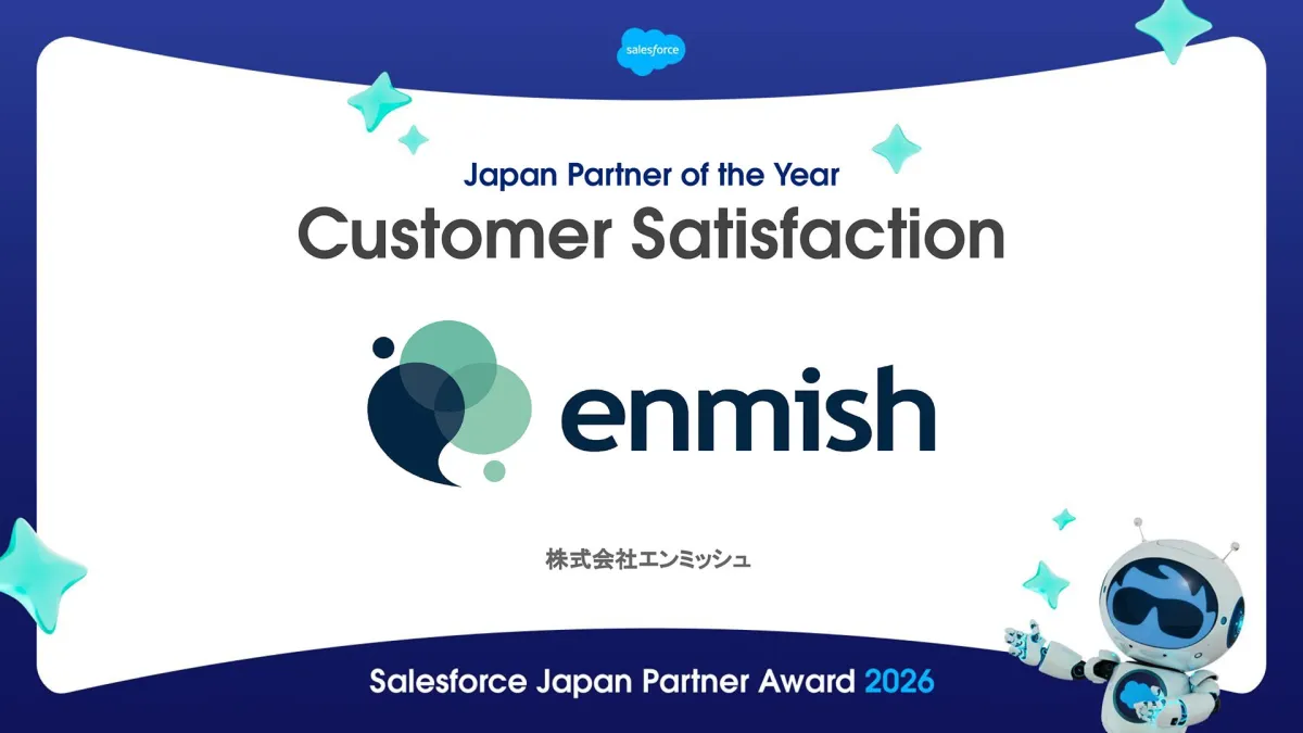 2026年のSalesforce Japan Partner Awardにおいて、株式会社エンミッシュは「Japan Partner of the Year – Customer Satisfaction」を受賞しました。エンミッシュは、Salesforce Navigator プログラムの「Cloud Expert」認定を受けた企業であり、小売、消費財、通信といった多様なカテゴリーで高いプロジェクト満足度を実現。これにより、クライアントのカスタマーサクセスに寄与したことが高く評価されています。
