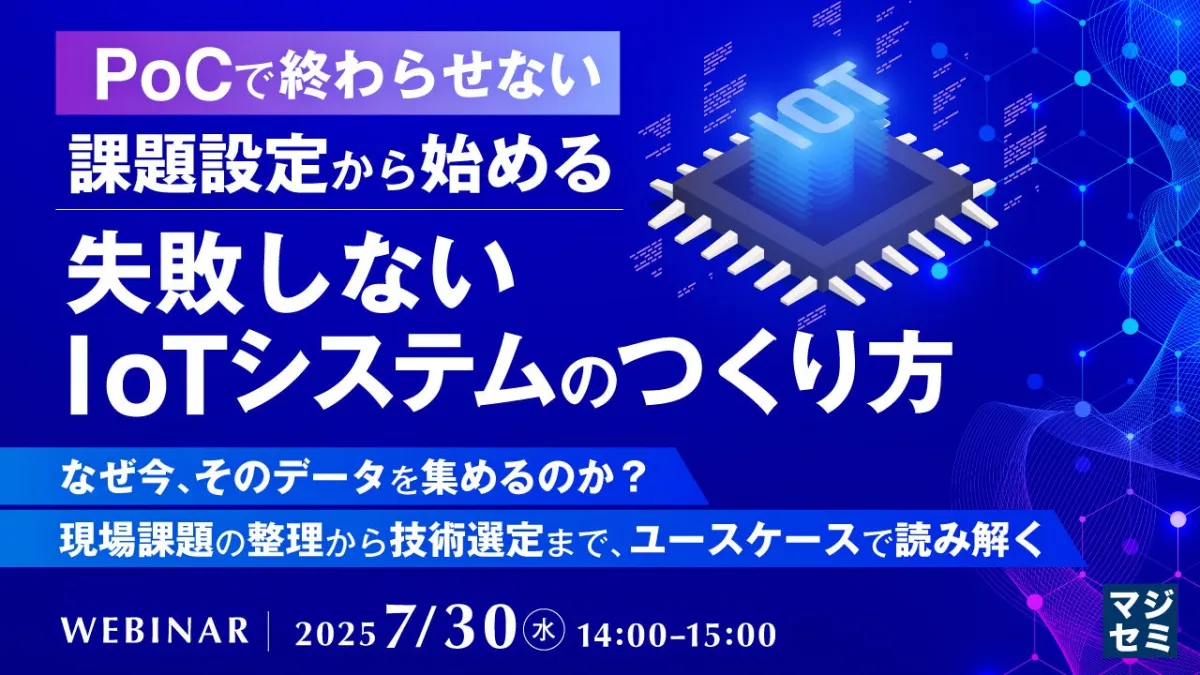 今回のウェビナーでは、「なぜPoCで終わるのか」という背景を分析し、具体的な対策を示します。また、IoTを導入するために必要な技術要素(センサー、ネットワーク、クラウドなど)についても解説します。