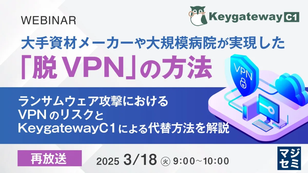 2024年11月25日に開催されるウェビナーでは、このような実際の事例を基にした「脱VPN」の手法を紹介する予定です。特に、ゼロトラスト接続サービスである「KeygatewayC1」を用いた安全なアクセス環境の構築法に焦点を当てます。このサービスを導入することで、VPNに代わる強固なセキュリティを実現し、ランサムウェアに対するリスクを大幅に低減することが可能です。