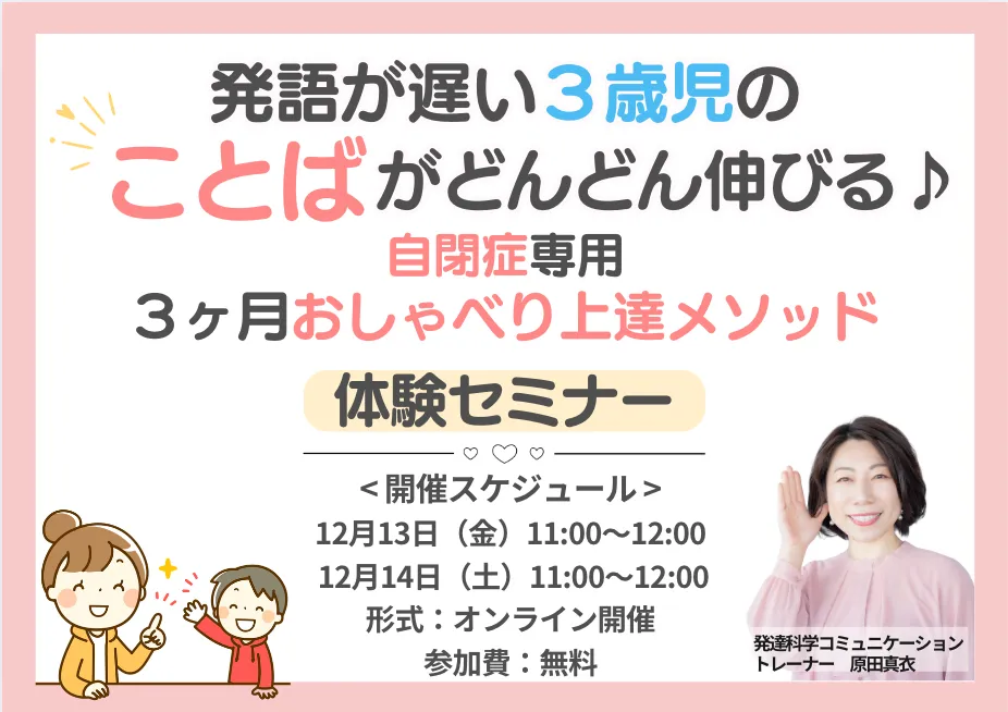 私、発達科学コミュニケーショントレーナーの原田真衣です。この度、発語が遅いお子さんを持つ親御さんに向けて、特に「発達の脳を育てる声かけ」にフォーカスした無料体験セミナーの受け付けを開始しました。参加することで、365日自宅でできる発語のサポート法を学ぶことができます。
