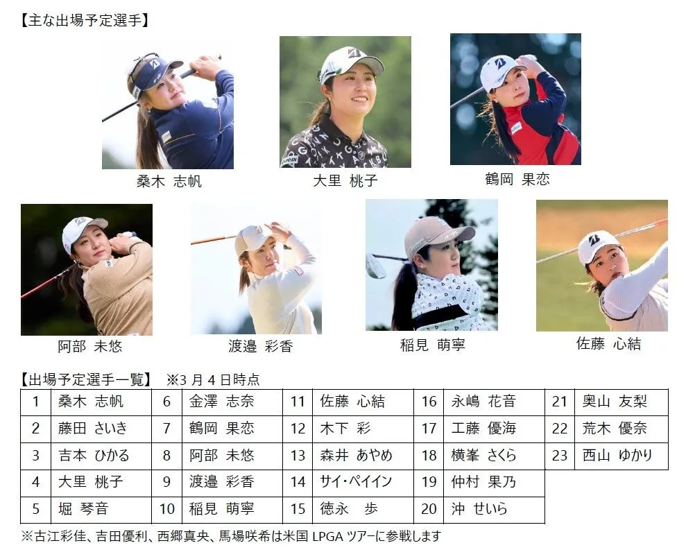 参加選手の中には、昨シーズンにおいて初優勝を果たし、続けて3勝を挙げた桑木志帆の姿が見られます。また、同じく初優勝を挙げた阿部未悠や佐藤心結といった若手選手も参戦します。これらの若手選手たちは、すでに国内女子ツアーでの実績を積んでおり、その成長が楽しみです。