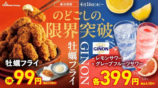 この機会に、チムニーの「GINON×牡蠣フライフェア」に参加して、美味しく楽しいひとときをお過ごしください。