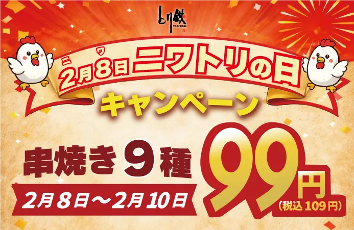 焼き鳥ダイニング「とり鉄」が、年に一度の『ニワトリの日』を盛大に祝う特別な企画を2026年2月に開催します。キャンペーンは2月8日(日)から2月10日(木)までの3日間にわたり行われ、期間中は人気の串焼き9種類が特別価格の99円(税込109円)で楽しめます。今年もやってきたこのお得な機会をぜひお見逃しなく!