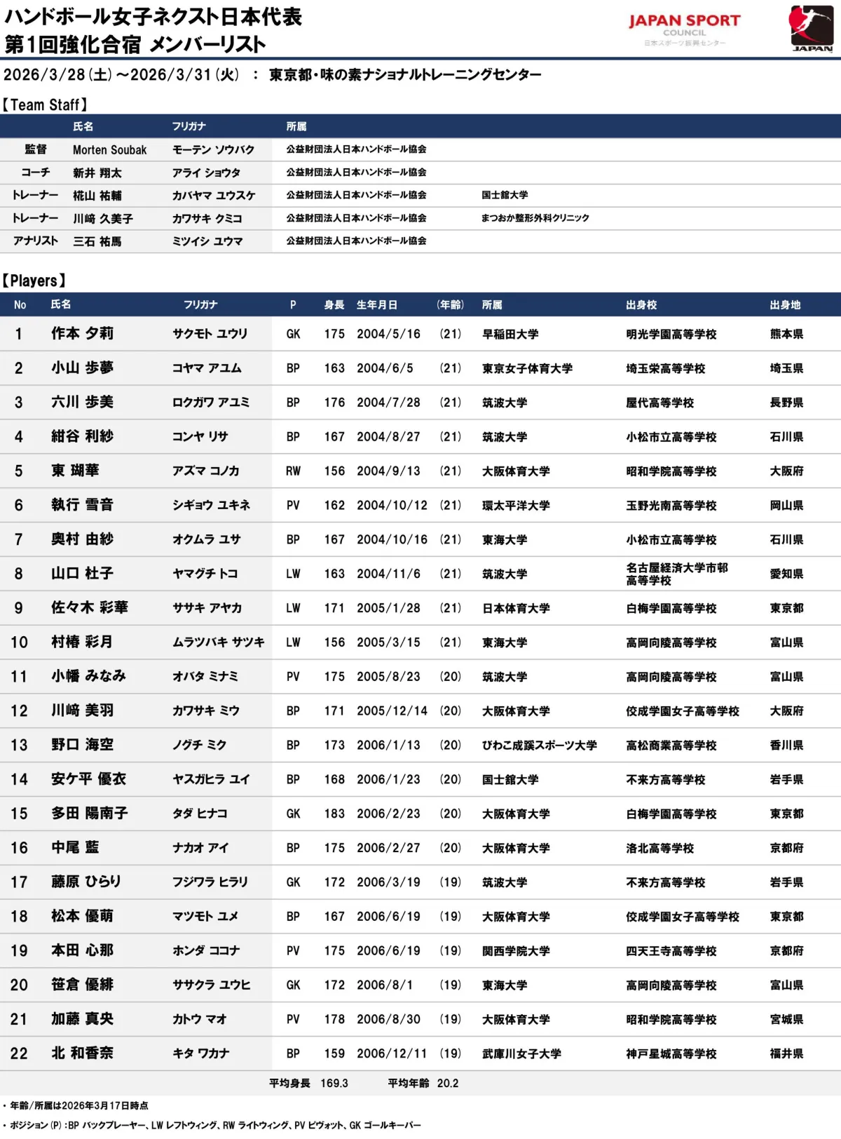 女子ネクスト日本代表には、監督にモーテン・ソウバク氏を迎えています。彼は過去にも日本代表を指導した経験を持ち、選手たちに高いレベルの指導を行うことが期待されています。また、コーチには新井翔太氏が名を連ねており、経験豊富なトレーナー陣が選手の健康管理やパフォーマンス向上に努めます。特にトレーナーの川崎久美子氏と椛山祐輔氏は、選手のコンディショニングに特化したプログラムを提供し、聞き手の良さを強化する計画を立てています。