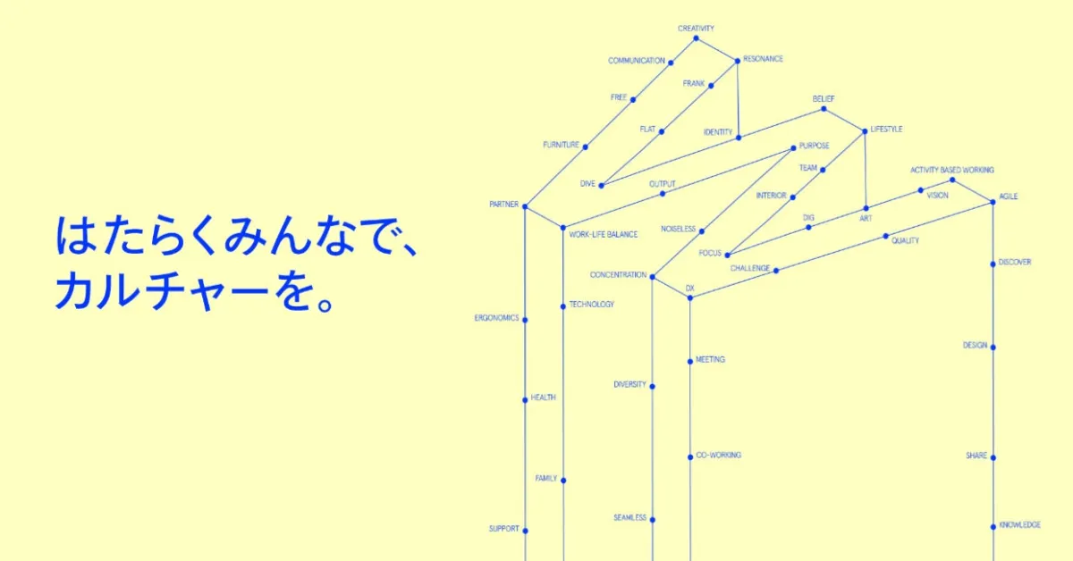 ショールームでは、展示されている家具がどのように企業文化に寄与するかを点と線で示し、価値観のつながりを明確にし、それぞれの企業のカルチャーを可視化します。これにより、「カルチャーの設計図」を描くための新たなアプローチとアイディアを紹介します。