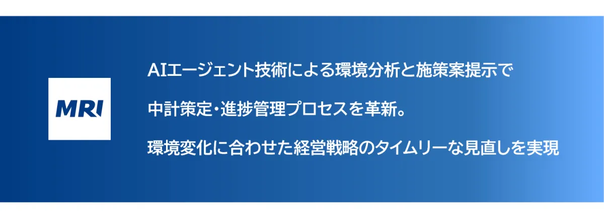 株式会社三菱総合研究所(MRI)は、2023年9月2日から中期経営計画の策定と推進管理にAIエージェントを活用する支援を始めました。経営戦略の変化に迅速に対応するため、MRIの豊富なインテリジェンスノウハウを基にしたAIエージェントを導入し、ビジネス環境を精緻に分析し、経営方針や施策案を提示します。