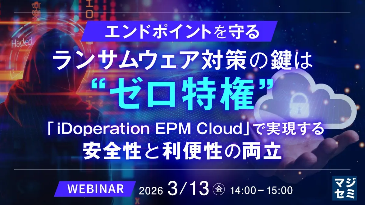 特権管理を実現する手段の一つが、Endpoint Privilege Management(EPM)です。EPMにより、業務を継続させながら特権をコントロールすることが可能になります。このセミナーでは、EPMの具体的な実装例や、マジセミが提供する「iDoperation EPM Cloud」ソリューションの活用デモも行います。