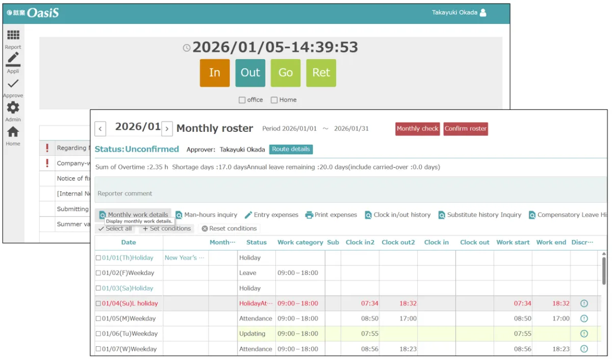 - - 従業員画面と管理者画面が英語で表示され、日報や打刻、届出申請などの主要操作を直感的に行えます。