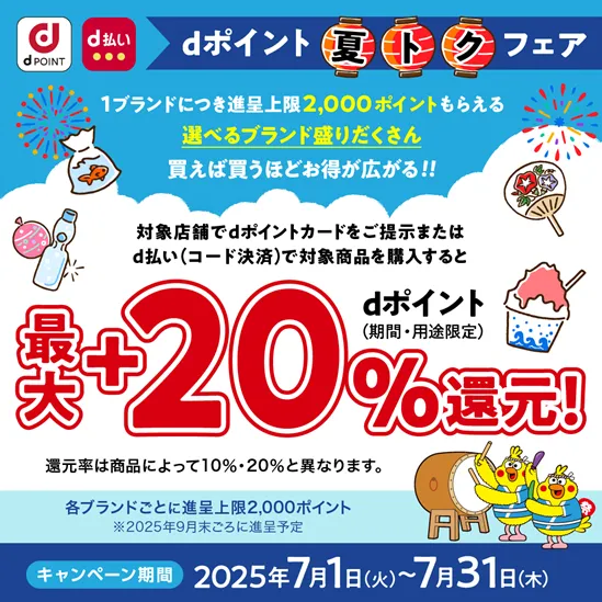 本キャンペーンでは、全国13社のd払い加盟店およびdポイント加盟店で、dポイントカードを提示するか、または「d払い」で対象商品を購入することにより、最大20%のポイント還元を受けられます。さらに、各ブランドごとにポイント進呈の上限が2,000ポイントとなっており、1人当たり最大で40,000ポイントの還元が見込まれています。ポイントは期間・用途限定で、条件や還元率は商品ごとに異なるため、詳細はキャンペーンサイトを確認してください。