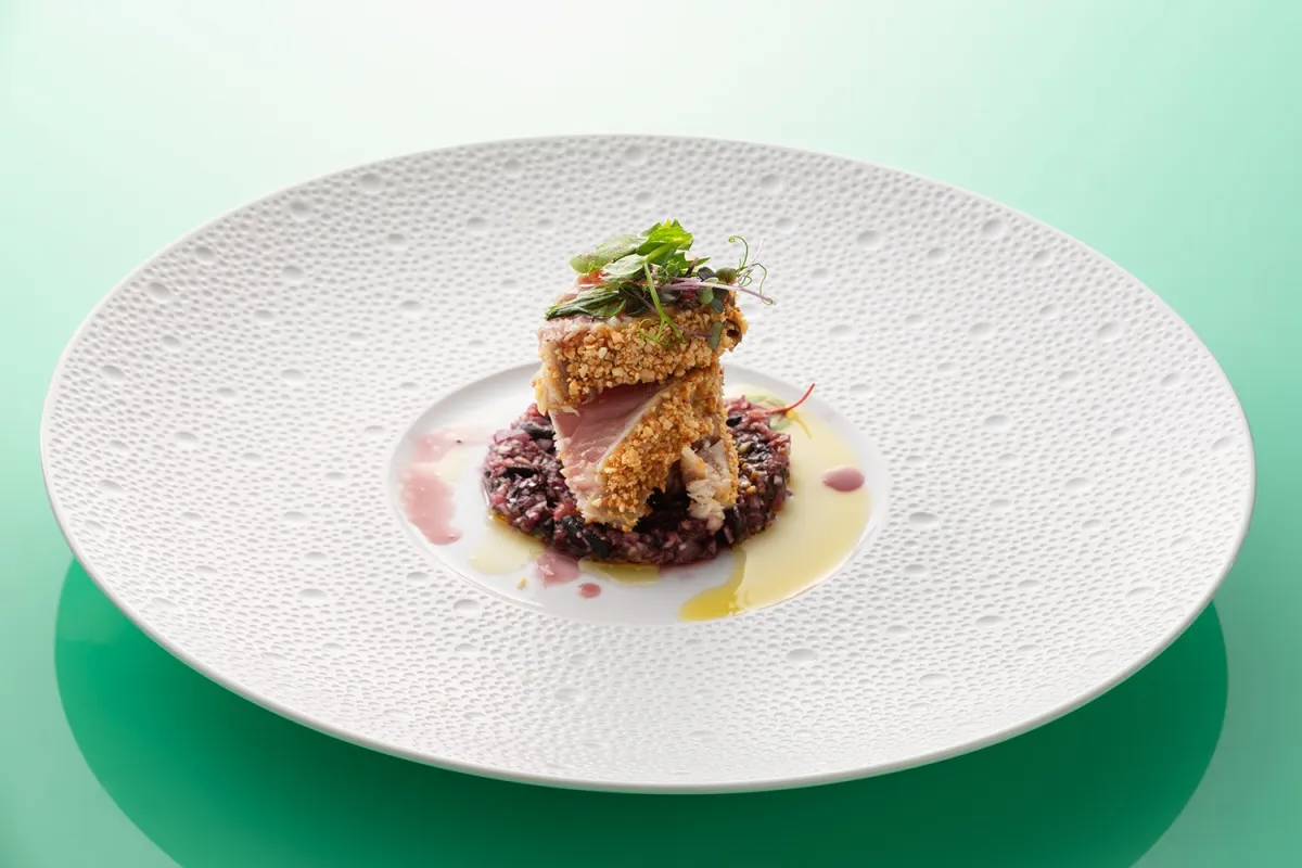 「プロを目指す学生部門」では、最優秀賞に輝いたのが「カツオのたたきのブルーベリーソース添え」です。カツオとブルーベリーという、一見ミスマッチとも思える組み合わせが、見事に調和した逸品でした。色鮮やかな盛り付けと独自のソースが特徴的で、味わいの深さにも審査員を魅了しました。