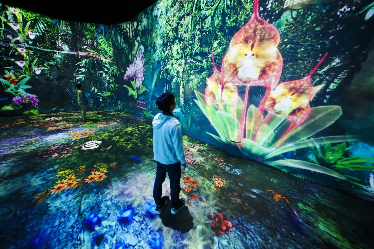 雲霧林内での植物と動物の共生を体験するエリア。来場者がプロジェクションマッピングに触れると、それぞれの植物と深く結びつく動物たちが姿を現し、共生の重要性を実感できます。