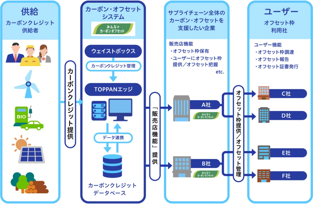 TOPPANエッジ株式会社と株式会社ウェイストボックスは、企業や金融機関向けにカーボン・オフセットを支援する新システム「みんなのカーボンオフセット™」を2025年1月29日より提供開始します。このサービスは、サプライチェーン全体の脱炭素化を実現するため、オフセット枠の提供を行う「販売店機能」を備えており、企業がカーボン・オフセットを導入する際の人材やノウハウの不足を解消します。