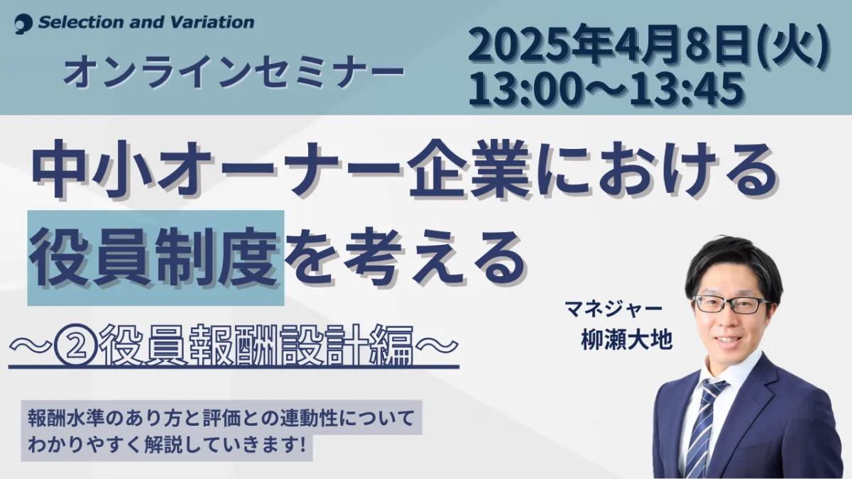 組織・人事コンサルティングファームのセレクションアンドバリエーション株式会社は、2025年4月8日(火)に、「夏冬賞与はこれからも必要なのか」というテーマでセミナーを開催します。こちらのセミナーは、特に非上場の中小オーナー企業に向けた役員制度の設計や報酬設計に焦点を当てています。