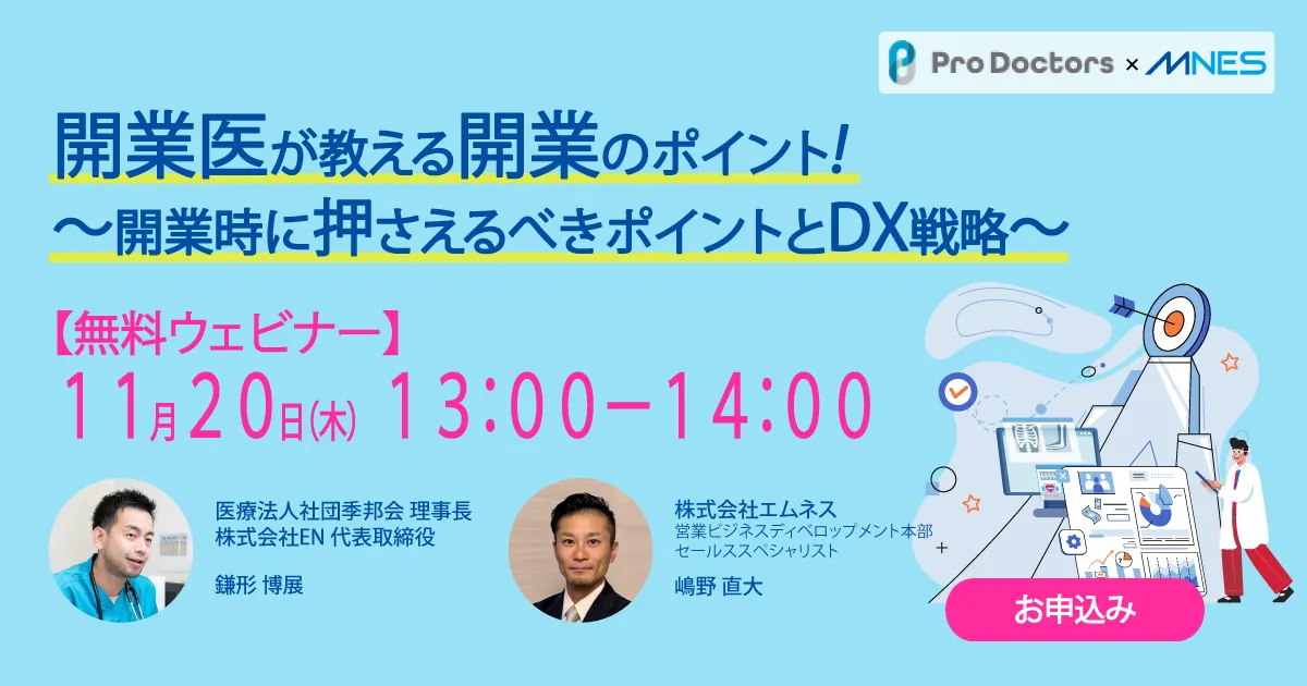2025年11月20日(木)13時から、株式会社エムネスが主催するセミナー「開業医が教える開業のポイント!~開業時に押さえるべきポイントとDX戦略~」がオンラインで開催されます。このセミナーでは、開業医としての経験を持ちながら株式会社ENの代表取締役でもある鎌形博展医師が、開業時に押さえるべき重要なポイントや、医療分野におけるデジタルトランスフォーメーション(DX)の戦略について詳しく解説します。