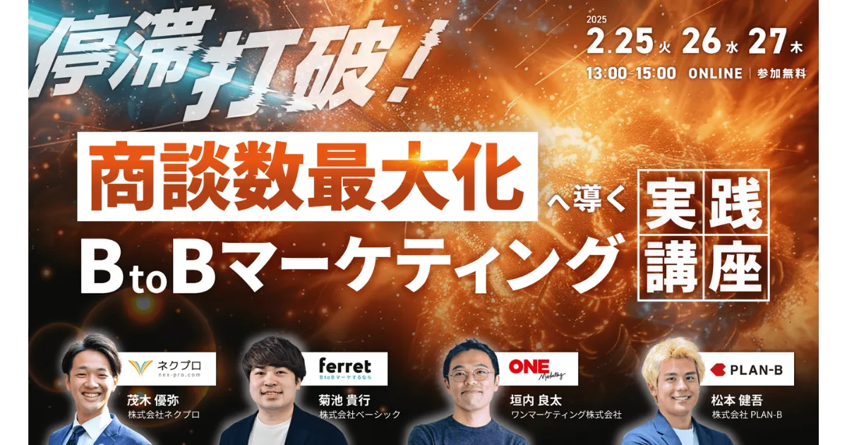 BtoBマーケティングを行っている企業は、リードを獲得することには成功していますが、商談に結びつけられずに悩んでいることが多いものです。このような課題を解決するために、株式会社ベーシックが運営する『ferret』が登壇するセミナー「停滞打破!商談数最大化へ導く BtoBマーケティング実践講座」が、株式会社ネクプロの主催により、2月25日から27日までの間、オンラインで開催されます。