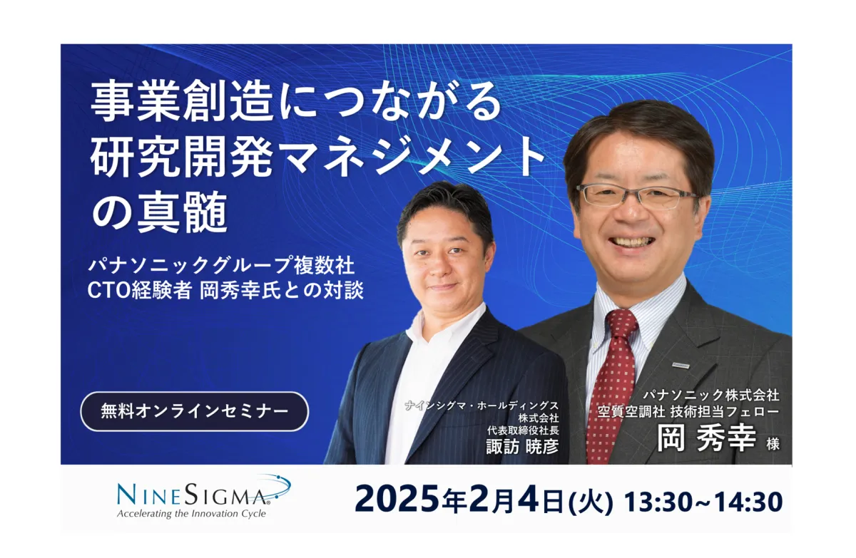 2024年2月4日、ナインシグマ・ホールディングス株式会社の主催により、パナソニックグループでのCTO経験を持つ岡秀幸氏とのオンラインセミナーが開催されます。本セミナーのテーマは「事業創造につながる研究開発マネジメントの真髄」です。参加登録は本日より開始されました。