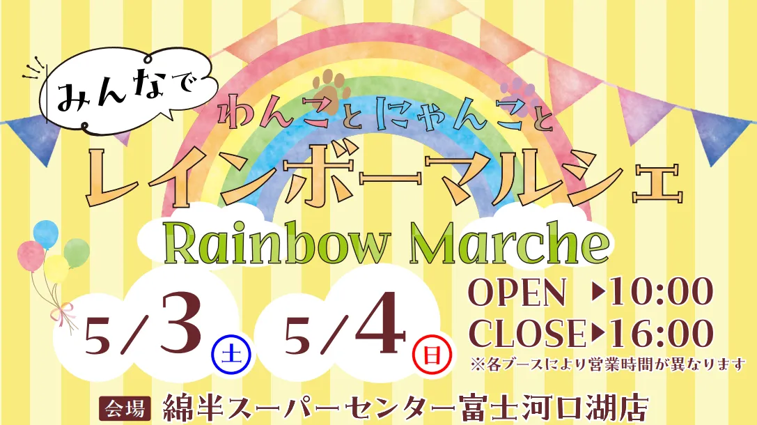 2025年5月3日(土)と4日(日)、山梨県の富士河口湖町にある綿半スーパーセンターで、特別イベント「わんことにゃんことみんなでRainbowマルシェ」が開催されます。このイベントは、ペットと一緒に楽しむことができる内容が盛りだくさんで、家族みんなで過ごす素晴らしい一日を提供します。