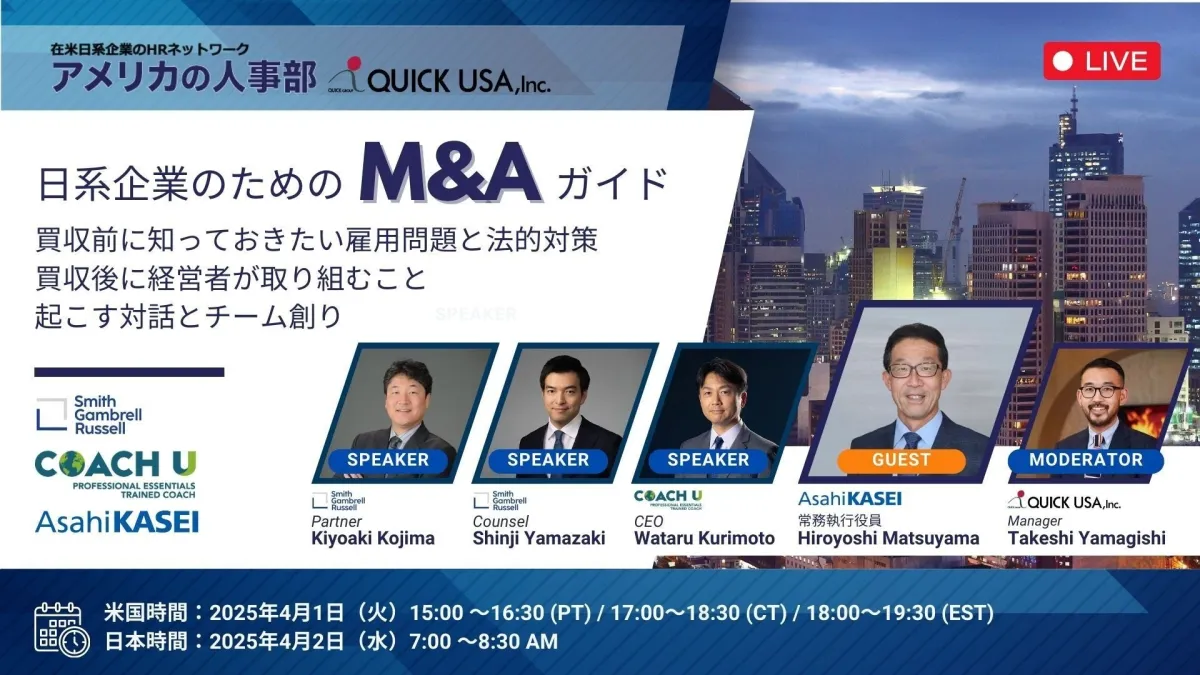 そこで、エグゼクティブ・コーチングを手掛ける株式会社コーチ・エィは、QUICK USA, Inc.と共催でウェビナー「日系企業のためのM&Aガイド」を開催することになりました。このウェビナーでは、特に人事にフォーカスを当て、雇用問題や法的対策について具体的な事例を通じて解説します。