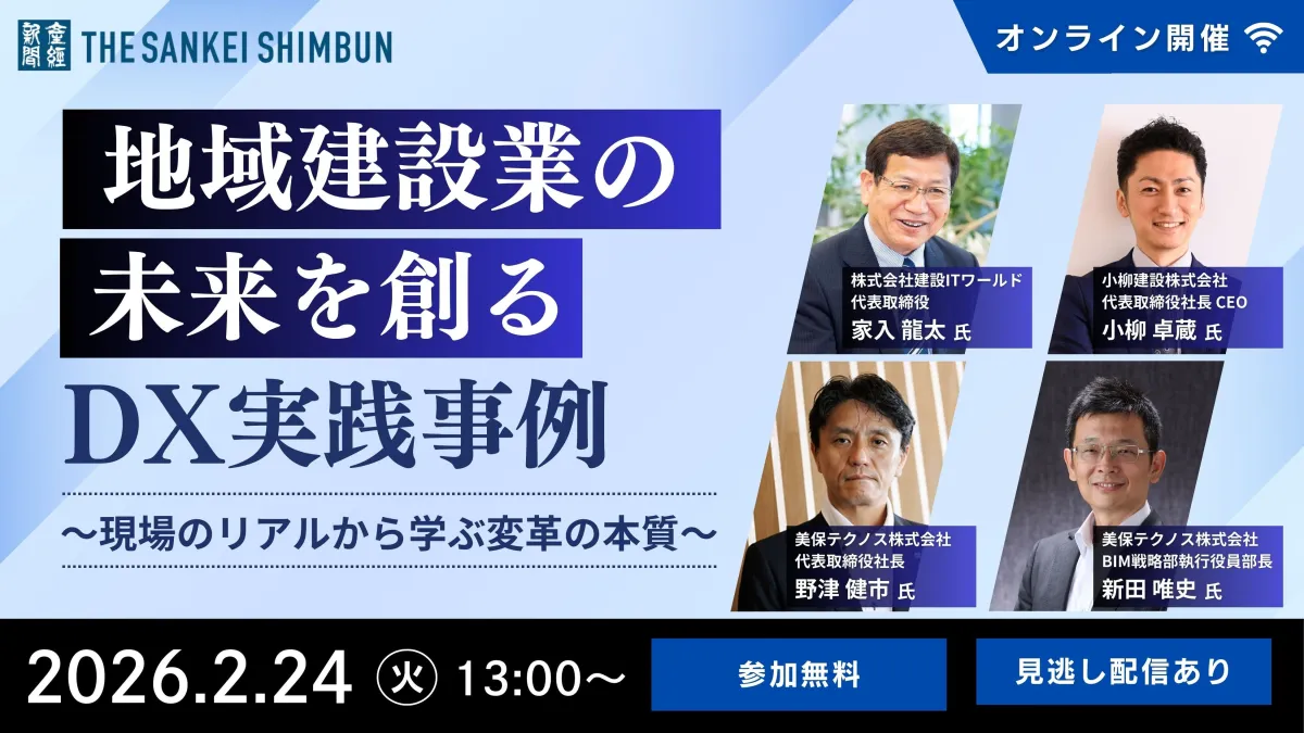 2026年2月24日、産経新聞社が主催するオンラインセミナー「地域建設業の未来を創るDX実践事例 ~現場のリアルから学ぶ変革の本質~」が開催されます。このセミナーでは、専門家や建設DXのリーダーたちが集まり、彼らの実際の体験に基づいた知見や事例を披露します。特に、建設業界が直面している人手不足という深刻な問題に対する具体的な解決策に焦点を当てています。