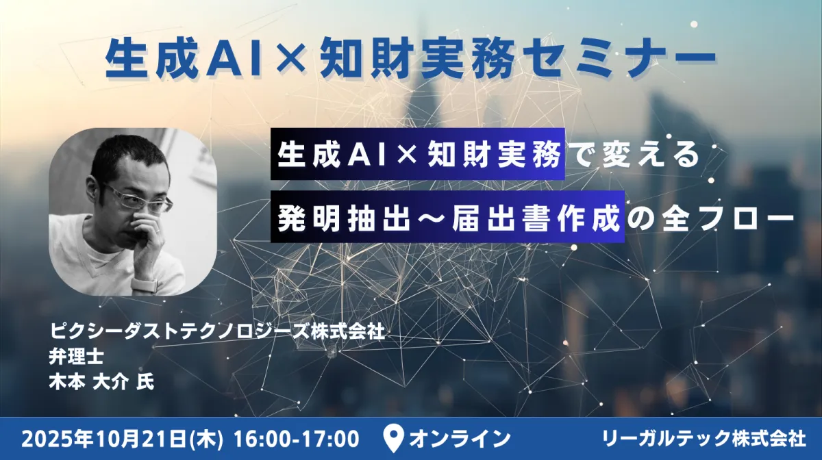 2025年10月21日、午後4時からオンラインで「生成AI×知財実務セミナー」が開催されます!このセミナーは、知的財産(知財)の領域における生成AIの活用方法について深く掘り下げる内容となっています。