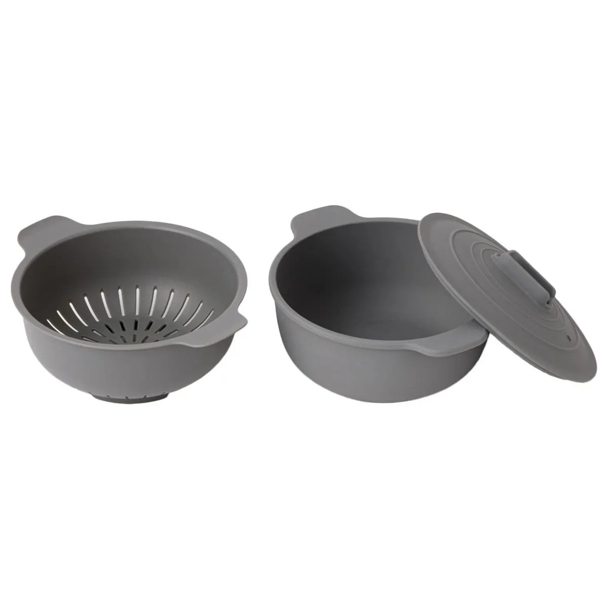 「土鍋風シリコーンポット ザル付き」の価格は999円(税込み)で、さらにリーズナブル。サイズは、幅22.5cm、奥行18cm、高さ11cmで、使いやすいコンパクトな設計です。色はダークグレーで、キッチンに馴染みやすいシンプルなデザインです。
