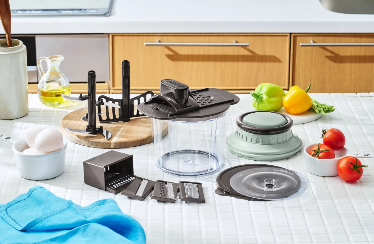 大容量1.5Lの容器は、特に家族の食事や作り置きのおかずに適しており、調理の幅も広がります。新しく付属した5枚のカッターパーツは、薄切り、薄千切り、つま切り、千切り、おろしの5つのカット方法に対応しているため、用途に応じて最適な切り方を選ぶことができます。