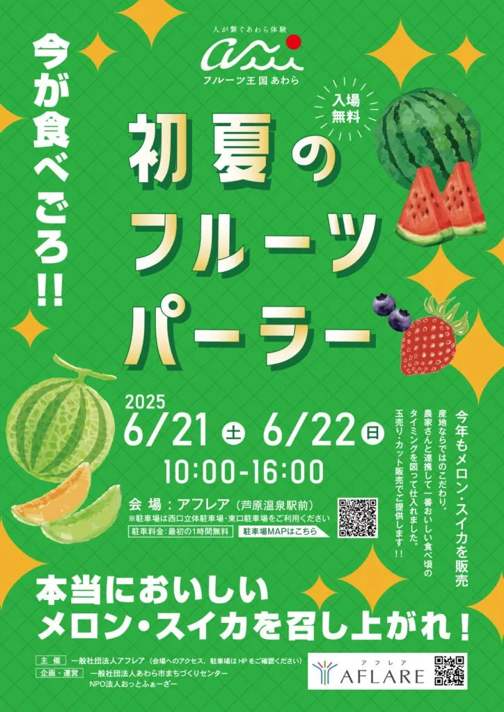 また、フルーツマルシェも開催されます。このマルシェには、あわらと坂井の農家から取り寄せた新鮮な野菜やフルーツを使ったスイーツが勢揃い。地元の魅力をふんだんに感じることができるこの場所で、メロンやスイカを産地価格で楽しむチャンスです。この機会にぜひ、アフレアまで足を運んでみてください!