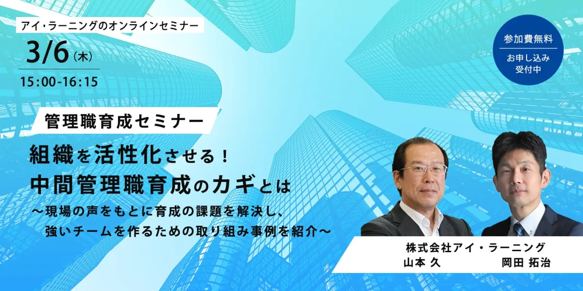 無償のオンラインセミナーでは、組織活性化に向けた中間管理職育成のポイントを深掘りします。本セミナーは、3月6日(木)に開催され、参加を希望する方は事前にWebサイトからの申し込みが必要です。