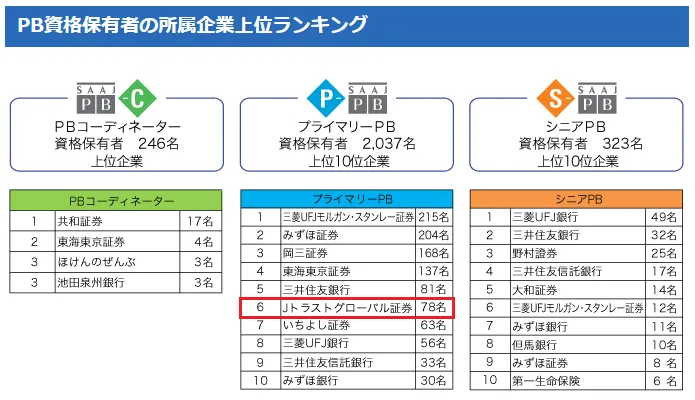 - - シニアPB: プライベートバンカーの最上級資格で、金融機関において管理職として活躍することが期待されています。