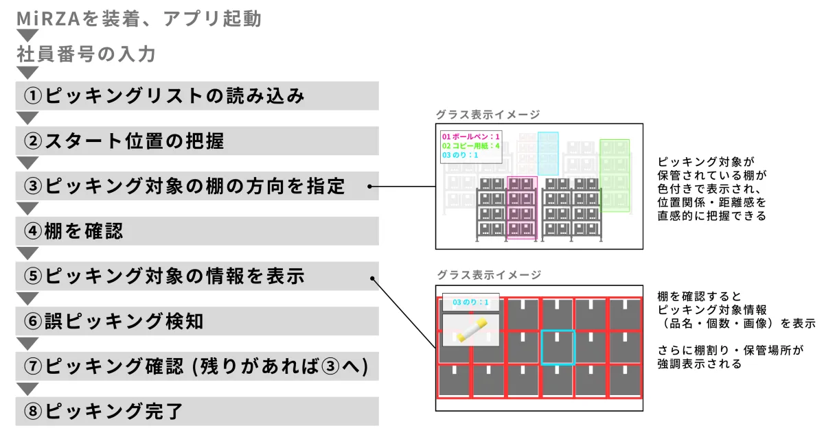 NTTコノキューによって開発されたXRグラス「MiRZA」は、軽量で装着しやすく、疲れにくいデザインが特徴です。約125gという軽さで、一般的なメガネに近い形状を持っています。また、無線接続されたスマートフォンを通じて、ハンドジェスチャーによるコンテンツ操作が可能です。これにより、作業者は物品の選別や棚位置の案内、誤出荷の防止といった機能を実現できます。