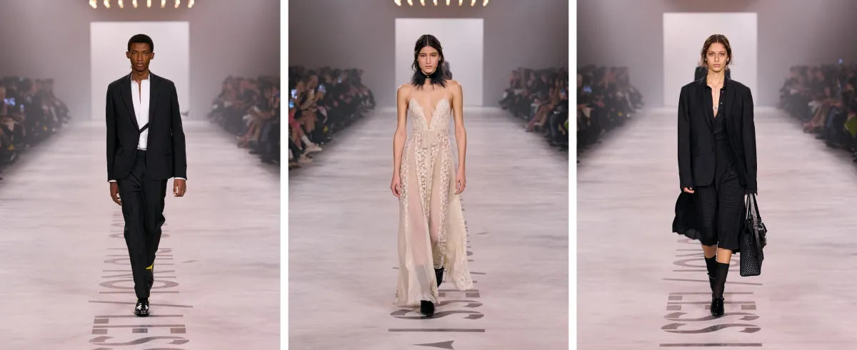 今回のコレクションでは、フェミニンとマスキュリンの概念が再定義され、男女の境界が曖昧にされています。ランウェイでは、男女が同時に登場し、性別に縛られないスタイルを提案。衣服が日常生活に不可欠なものであると再認識される場面が展開されます。