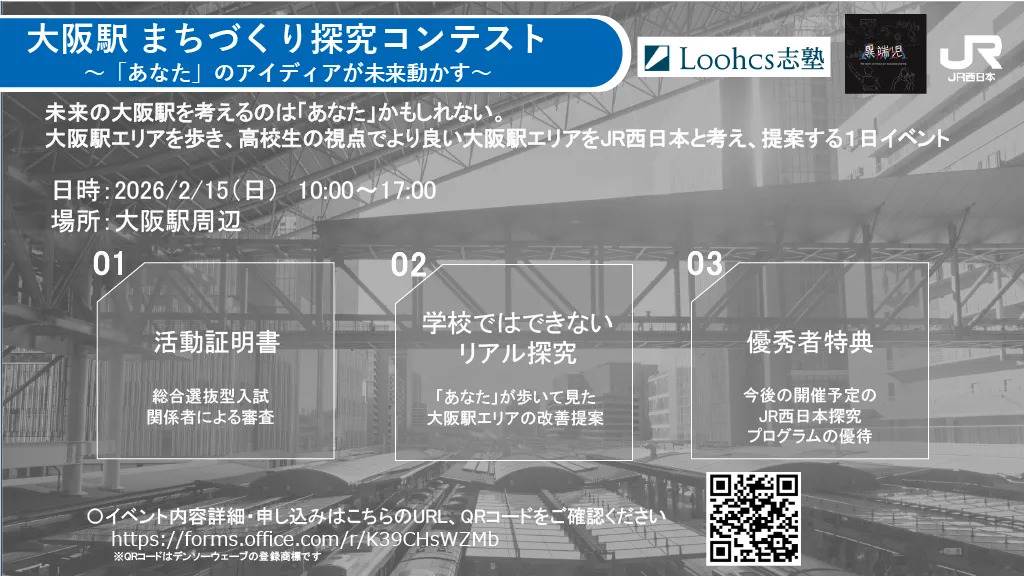 「大阪駅 まちづくり探究コンテスト」は、SR西日本とLoohcs志塾が共同で提供するユニークな体験型イベントです。未来の大阪駅を探る高校生たちがどのように課題を発見し、解決策を提案するのか、その結果がとても楽しみです。このイベントを通じて、高校生たちの挑戦が大阪駅の未来を変えていくことを期待しています。