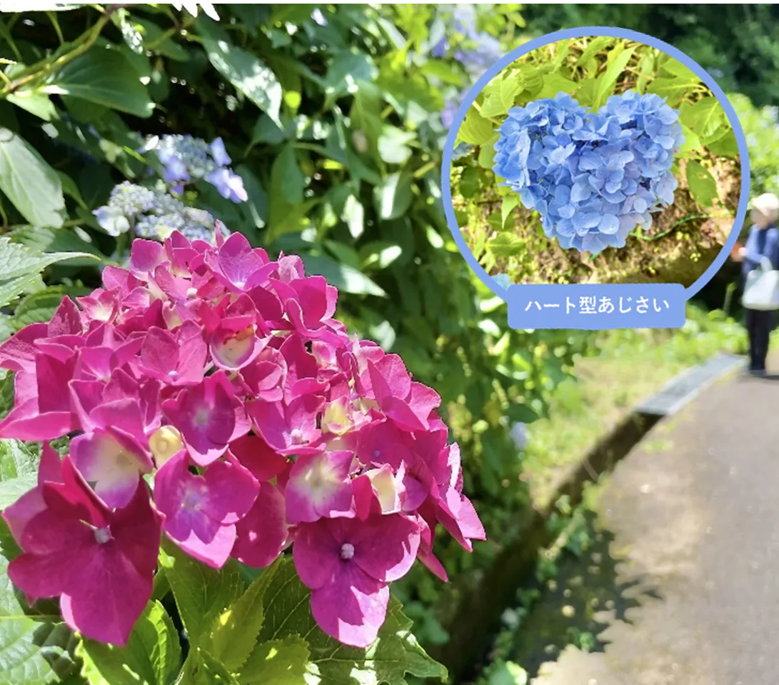 このあじさい園では、30以上の品種のあじさいが色とりどりに咲き誇る様子が楽しめ、約1.5キロメートルにわたる遊歩道を散策しながら、その美しさを堪能することができます。そして、特に注目すべきは「ハート型あじさい」を探す楽しみ。SNSでも話題になっており、自然が作り出す愛らしい形のあじさいは、訪れるカップルや家族連れ、写真愛好家にとって、必見のフォトスポットです。特に、かわいらしいハート型のあじさいは、多くのカメラマンやインスタグラマーたちに人気を集めています。