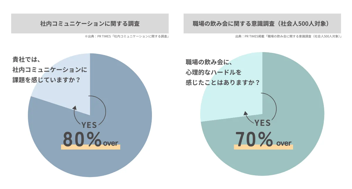 最近の調査結果によると、企業の80%以上が社内コミュニケーションに何らかの課題を抱えていると答えています。さらに、職場の飲み会を「行きたくない」と感じる人は73.6%に達し、その理由として「気を遣う」「プライベートを大切にしたい」という意見が多く挙げられています。また、上司や管理職も部下を飲み会に誘うことに対して戸惑いを感じているようです。