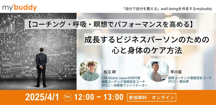 4月7日の世界保健デーに向けて、オンラインコーチングプラットフォーム「mybuddy」は、成長するビジネスパーソンのための特別なイベントを開催します。このオンラインイベントでは、コーチング、呼吸、瞑想を組み合わせたプログラムを通じて、心と身体のケアについて学ぶことができます。