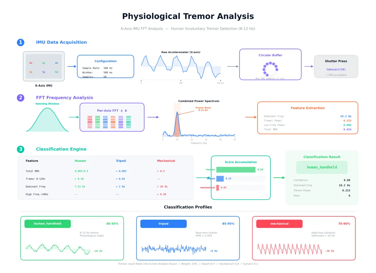 人間の手が示す不随意の生理的振戦を利用し、撮影の手法(人間、三脚、機械)を高精度で判別します。
