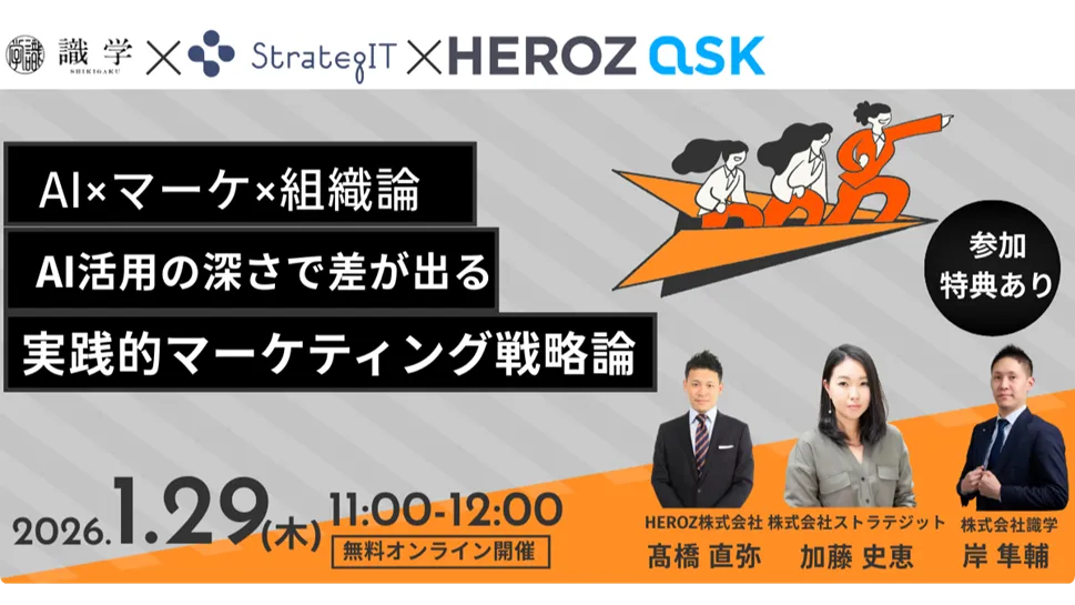 2026年1月29日、HEROZ株式会社、株式会社ストラテジット、株式会社識学の3社が共催する無料ウェビナー「AI×マーケ×組織論。AI活用の深さで差が出る実践的マーケティング戦略論」が開催されます。今回は、生成AIを業務にどのように活用し、組織マネジメントに結びつけるかについて深く掘り下げます。