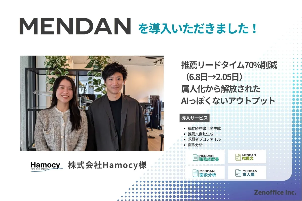 株式会社Hamocyは「働くに意味を創出し続ける」を掲げ、求職者一人ひとりの価値観と向き合っています。丁寧な支援スタイルを重視しながらも、書類作成や面談記録に時間が取られてしまう現状に直面していました。そんな中で、MENDANの導入が効率化と質の向上をもたらしています。