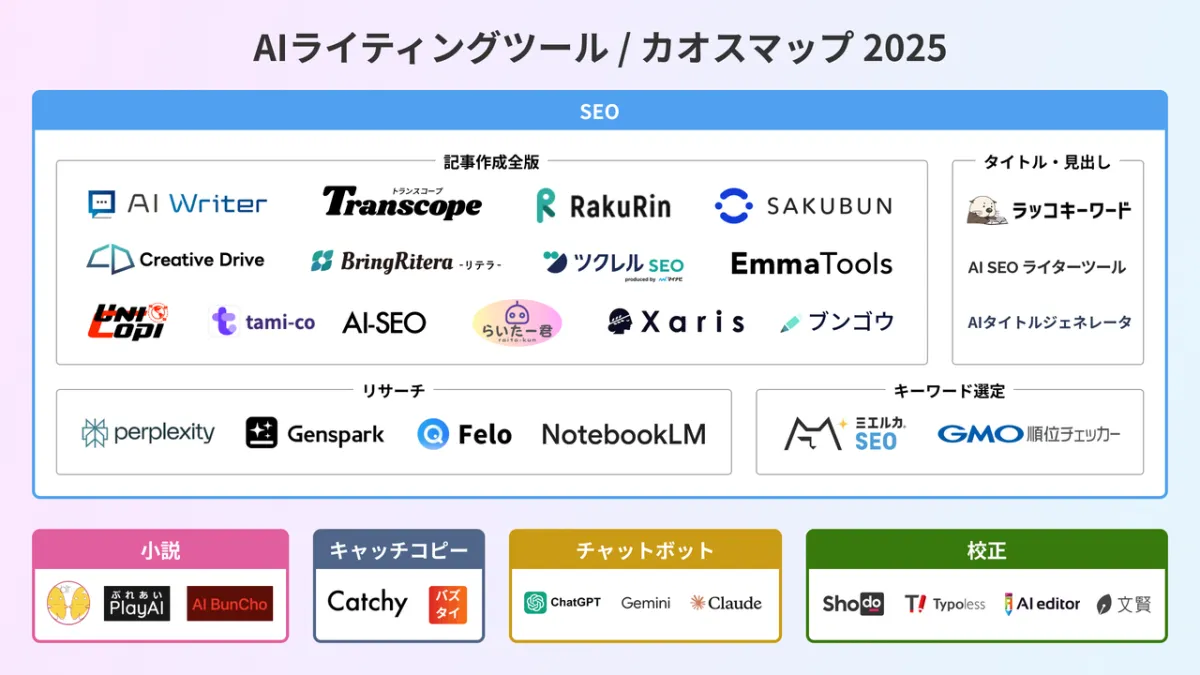 合同会社ゼロイチスタートが提供するAIライティングツール「AI Writer」は、AIライティングツール市場において新たな情報を提供する「2025年度 AIライティングツールカオスマップ」を発表しました。このカオスマップは、国内外で急速に進化するAIライティングツールの現状を把握し、読者が自分に合ったツールを見つけやすくするために作成されました。