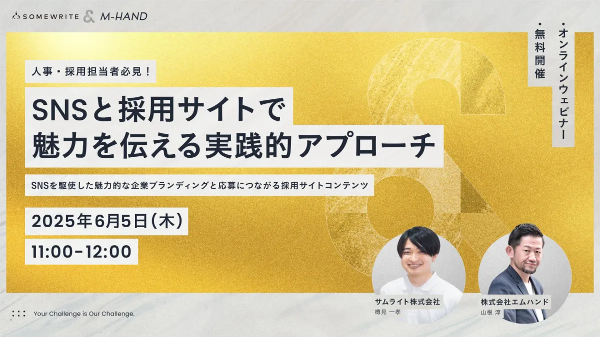 6月5日11時より、サムライト株式会社が主催する無料セミナー「人事・採用担当者必見!SNSと採用サイトで魅力を伝える実践的アプローチ」がオンラインで開催されます。このセミナーは、企業の人事担当者や採用に関わる方々に向けて、共感を生む採用サイトコンテンツの作成法やSNSの活用方法を学べる貴重な機会です。