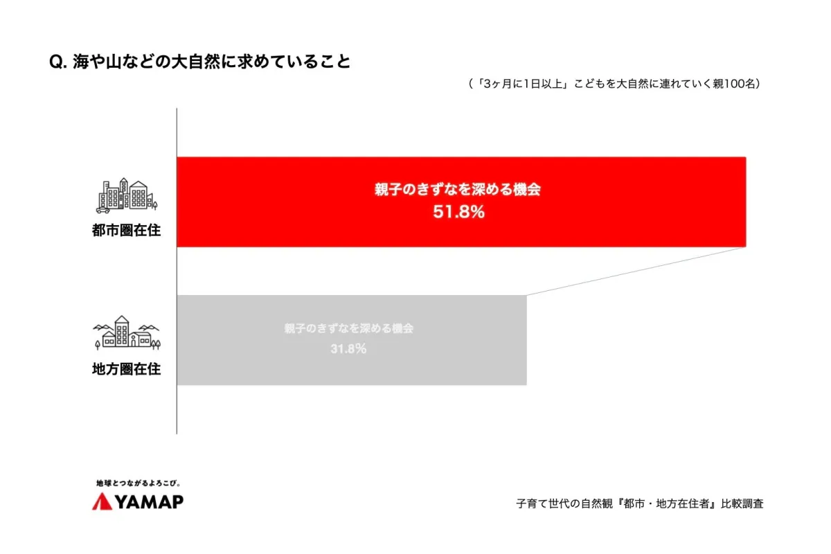親子の絆と自然: 調査によれば、都市圏の子育て世代は自然体験が不足していると強く感じ(77%)、これを親子の絆を深めるための貴重な機会と認識していることが明らかになりました。また、都市圏の親は「自宅の近くに自然が少ない」と感じている割合が53.8%に達し、どこに行くべきか分からないという声も多く寄せられました。