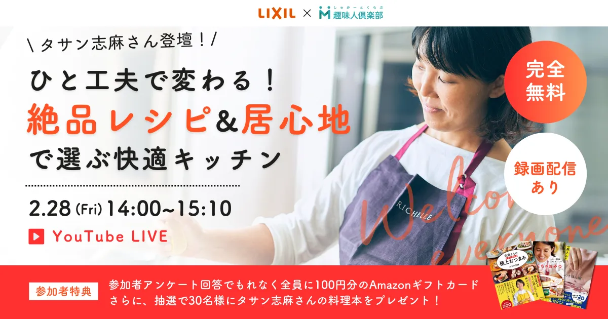 株式会社オースタンスとLIXILが共催する『ひと工夫で変わる!カンタン絶品料理イベント』が、2月28日(金)にオンラインで開催されます。このイベントでは、テレビやYouTubeで人気のタサン志麻さんが、春の旬の食材を用いて、誰でも簡単に作れる美味しいレシピを実演します。
