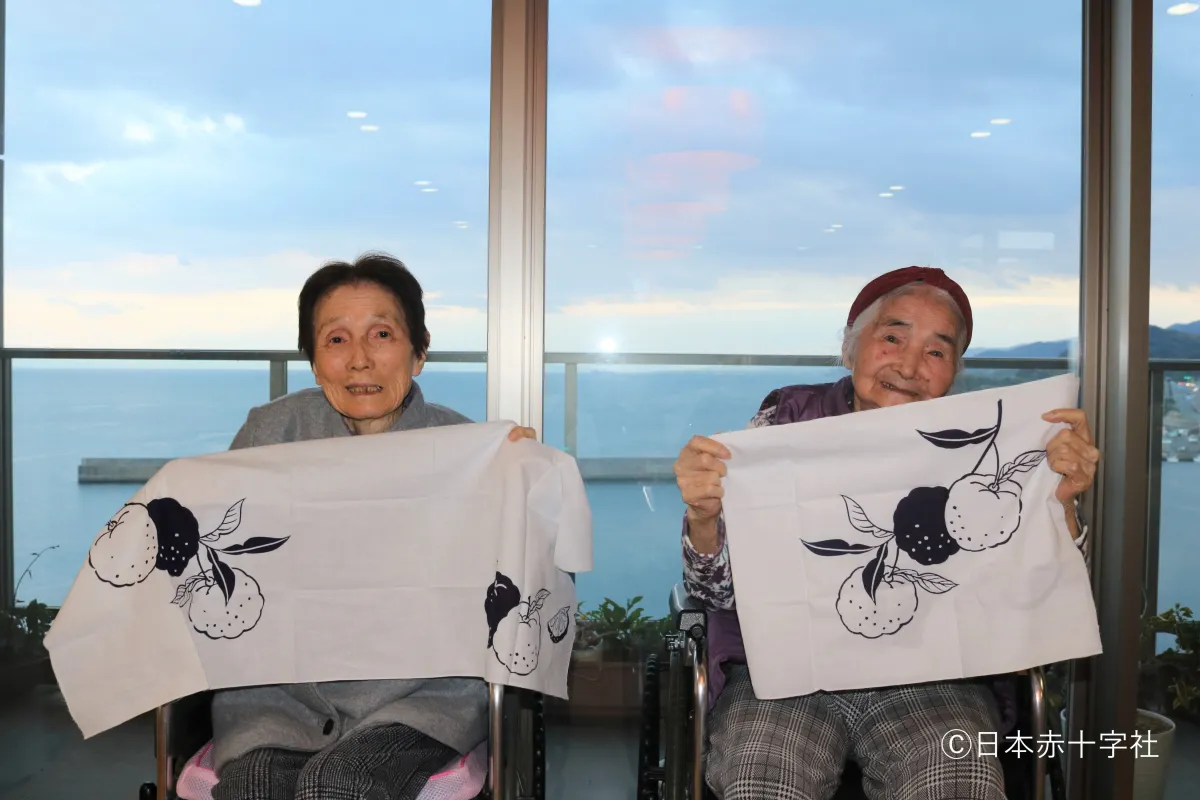 さらに、日本赤十字社福岡県支部の特別養護老人ホーム大寿園では93歳の木下千尋さんが「綺麗な柄の手ぬぐいで嬉しいです。大事に使います。ありがとうございます」と感謝の気持ちを伝えました。