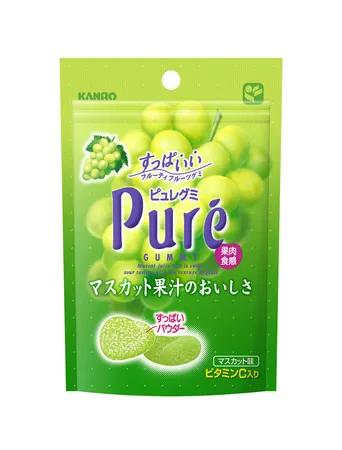 「ピュレグミ」の最大の特徴は、フルーツのすっぱいおいしさと果肉の食感が見事に融合されている点です。グミの外側にかかるすっぱいパウダーが、フルーツの自然な甘さを引き立て、食感も楽しめるのが魅力。今年は新たに加わったマンゴー味とマスカット味が、従来のレモン、グレープ、青りんごの味わいをさらに豊かにしています。