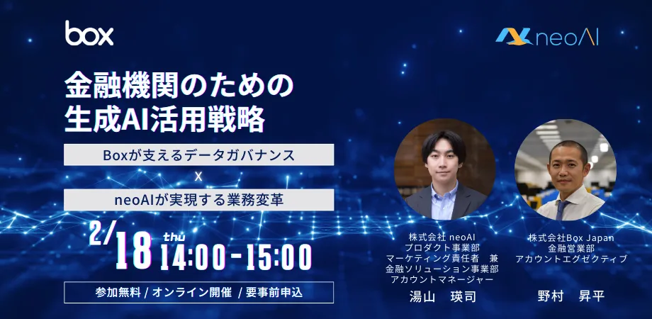 2023年2月18日木曜日の14時から15時まで、オンラインにて「金融機関のための生成AI活用戦略」というセミナーが開催されます。主催は株式会社neoAIとBox Japanで、金融業界の皆様を対象にした内容です。特に、生成AIを用いたデータガバナンスおよび業務の変革について深く掘り下げられた内容となっています。